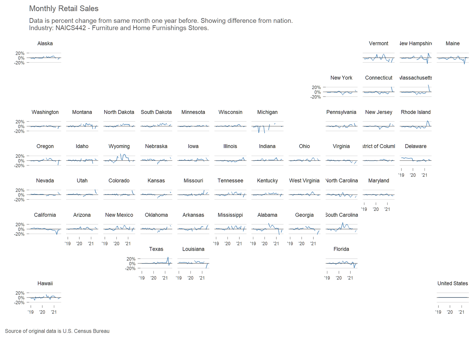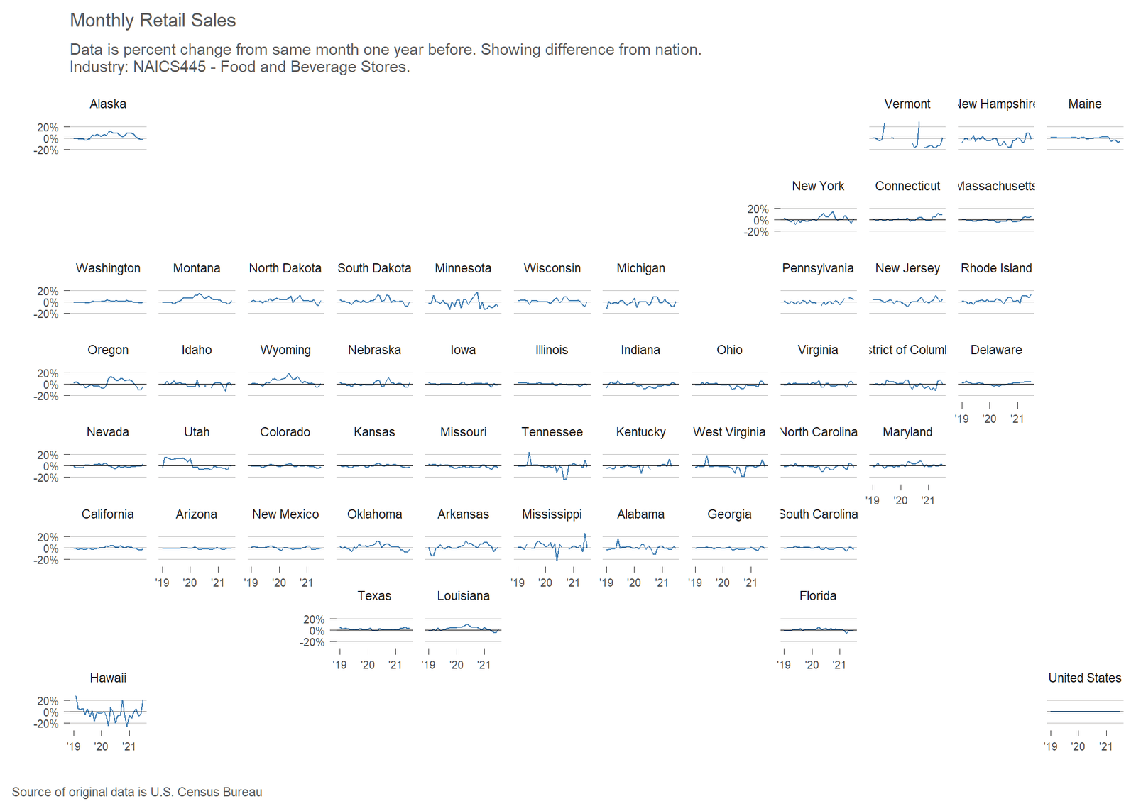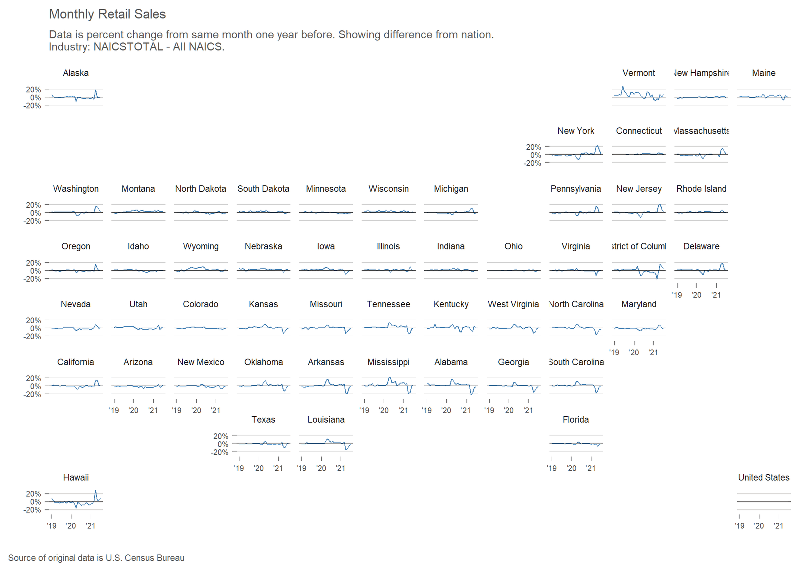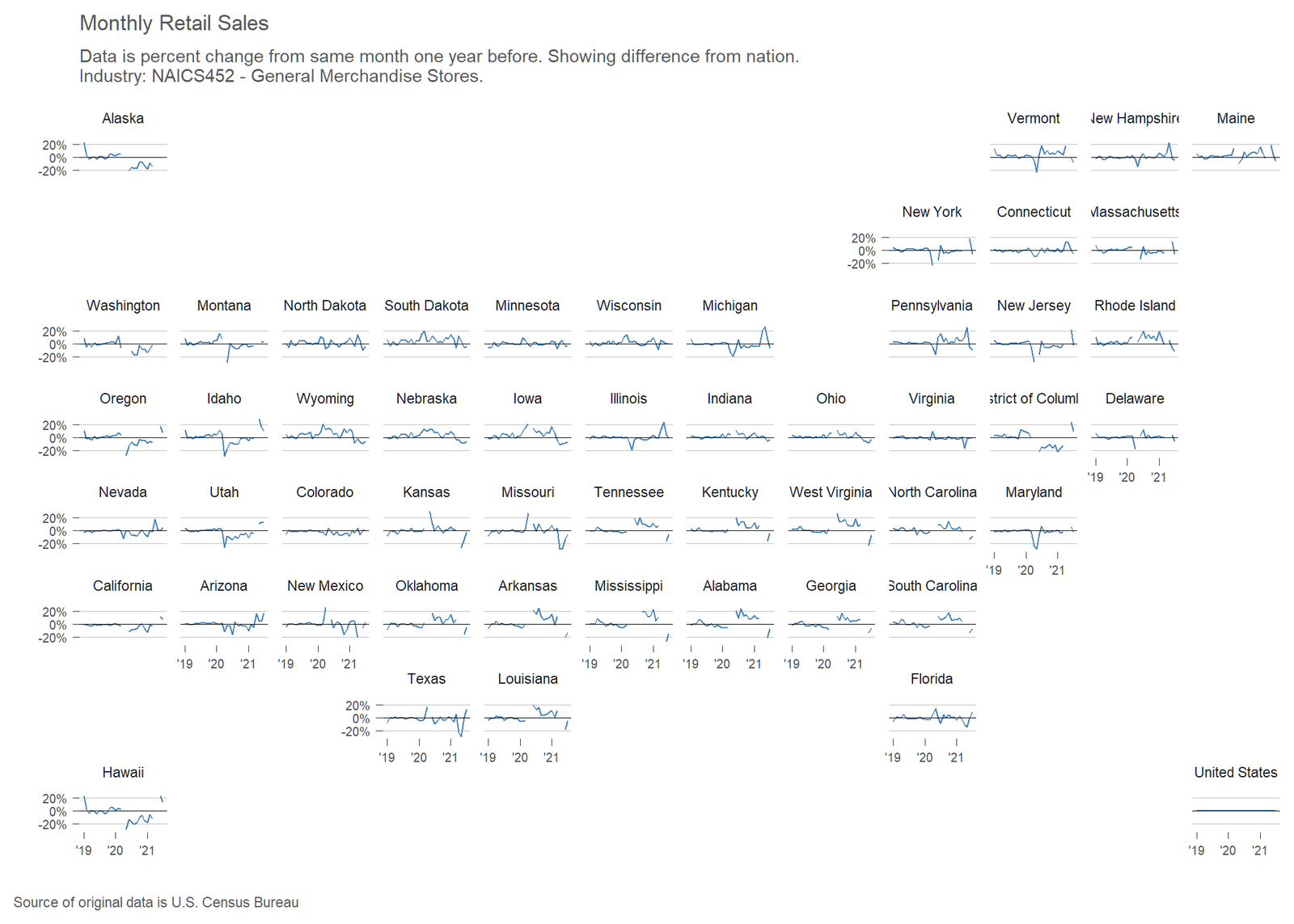 Monthly retail sales by state and major retail sector, in an interactive visualization.