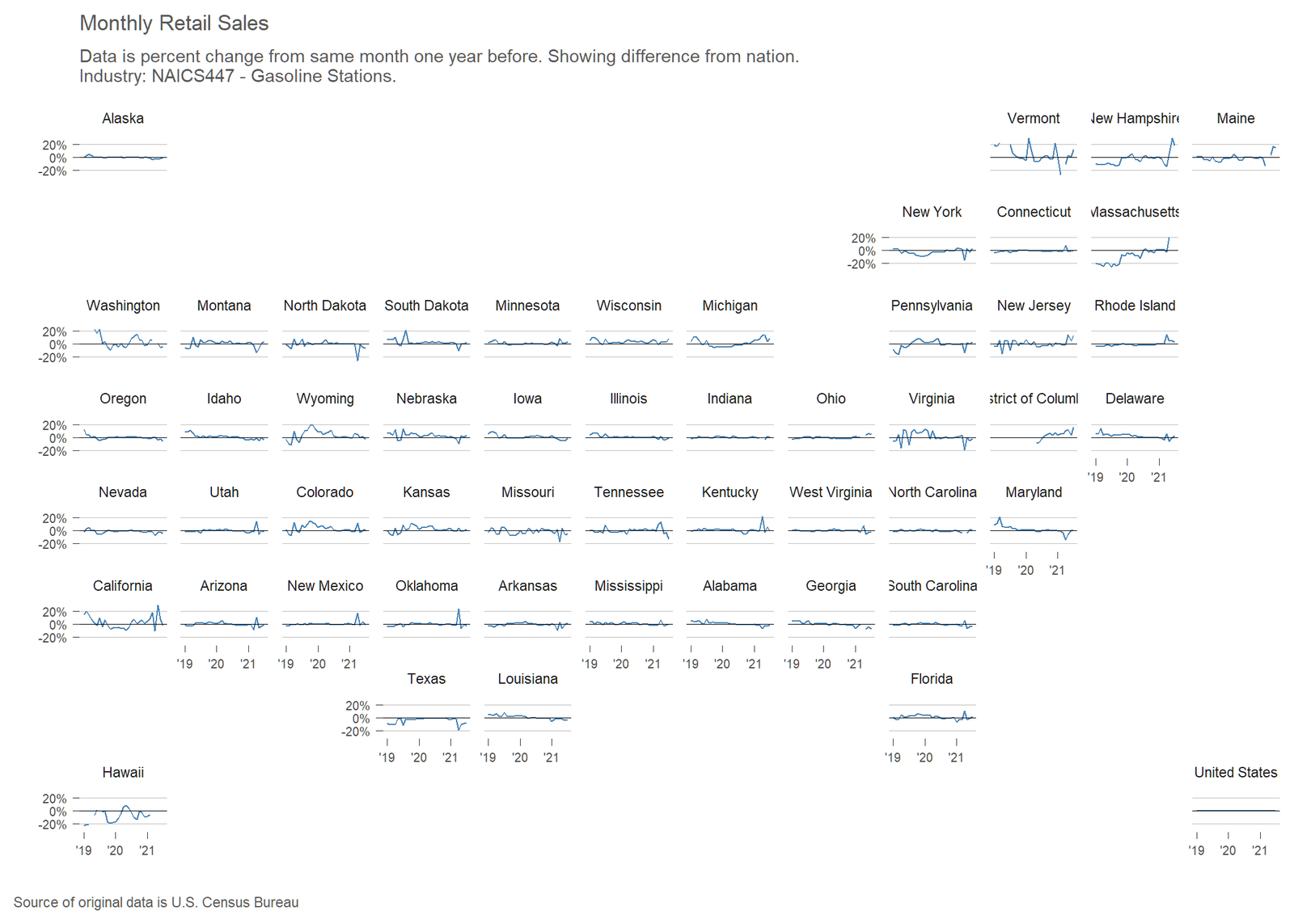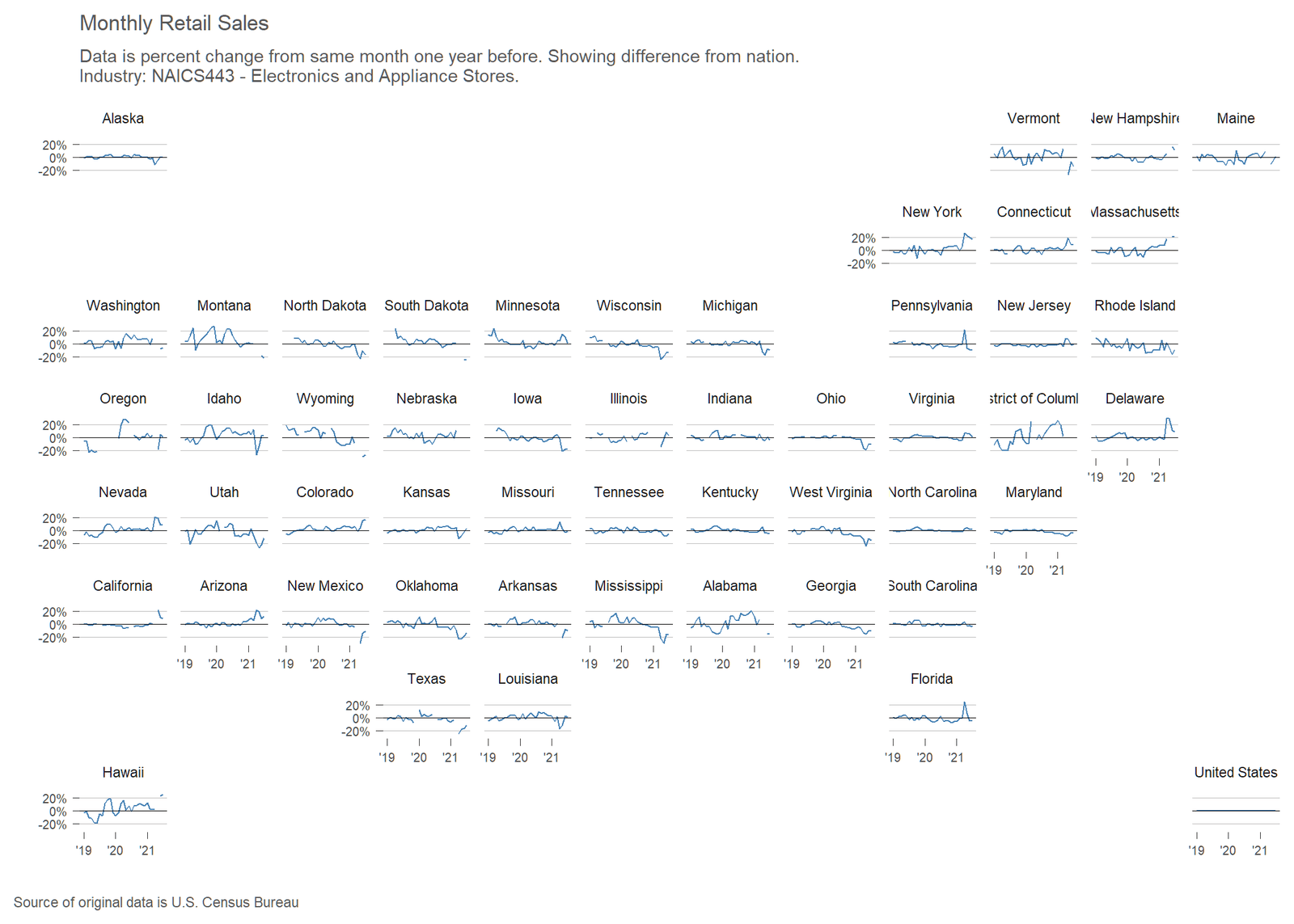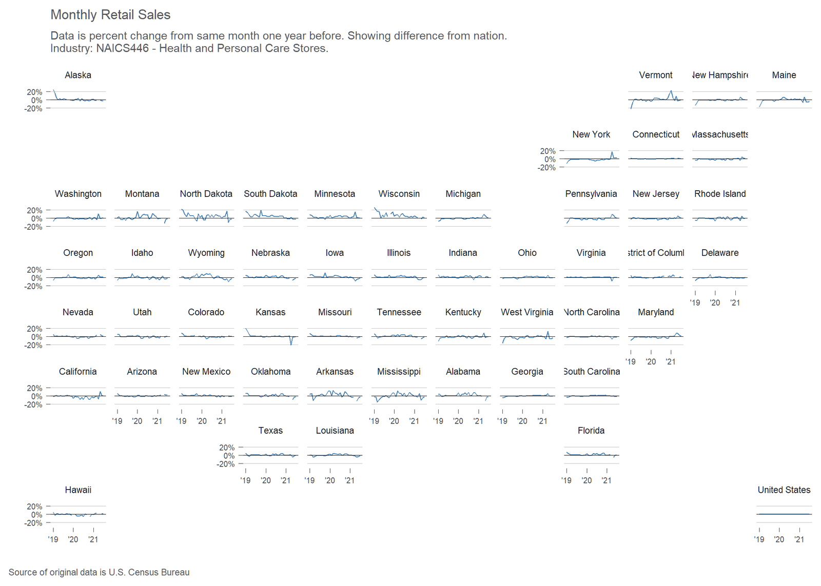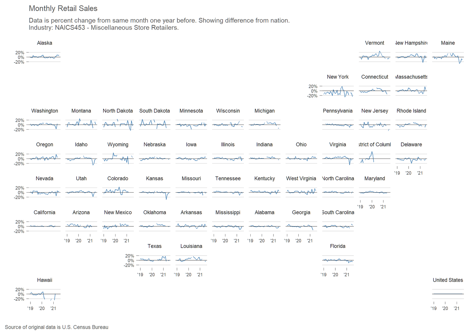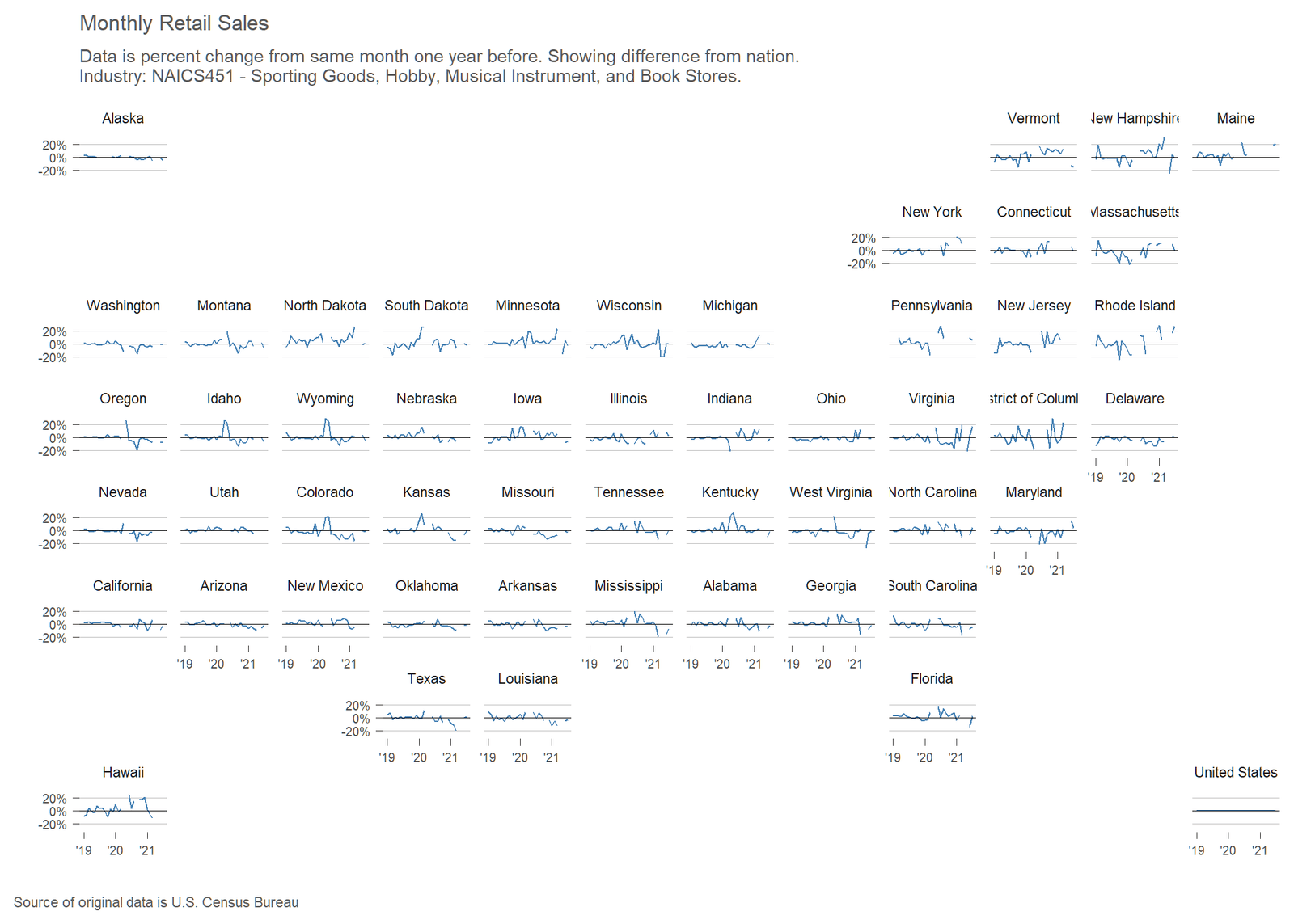The United States Census Bureau has released an experimental data product reporting monthly retail sales at the state level for major retail sectors. I’ve gathered the data and created an interactive visualization.