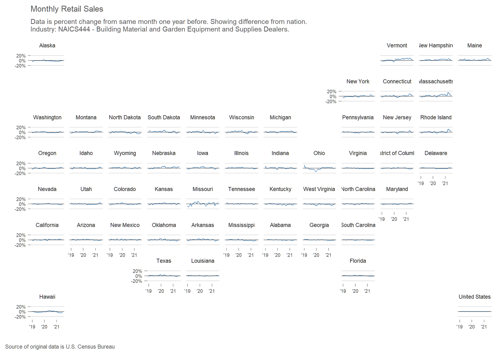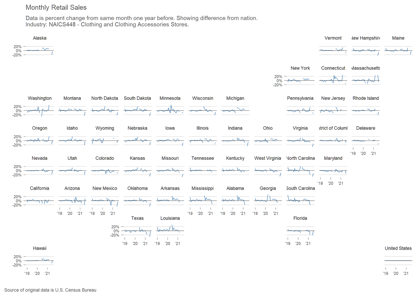 I’ve constructed a series of charts for this month, one for each retail sector covered by this data. These charts show, for each state, the difference between the state and the nation. A state with a relatively flat line around zero indicates that the state closely followed the national trend. Click on an image to view and browse images.